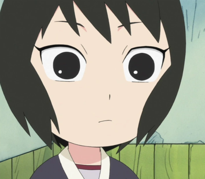 Shizune is a fair-skinned woman with black eyes and hair. Her hair is straight and shoulder-length with bangs that cover her ears and frame her face. Shizune is usually seen in a long bluish-black kimono with white trimmings, held closed by a white obi, and open-toed sandals with low heels.